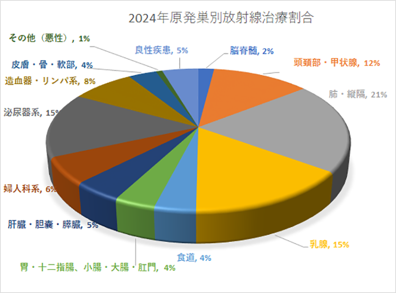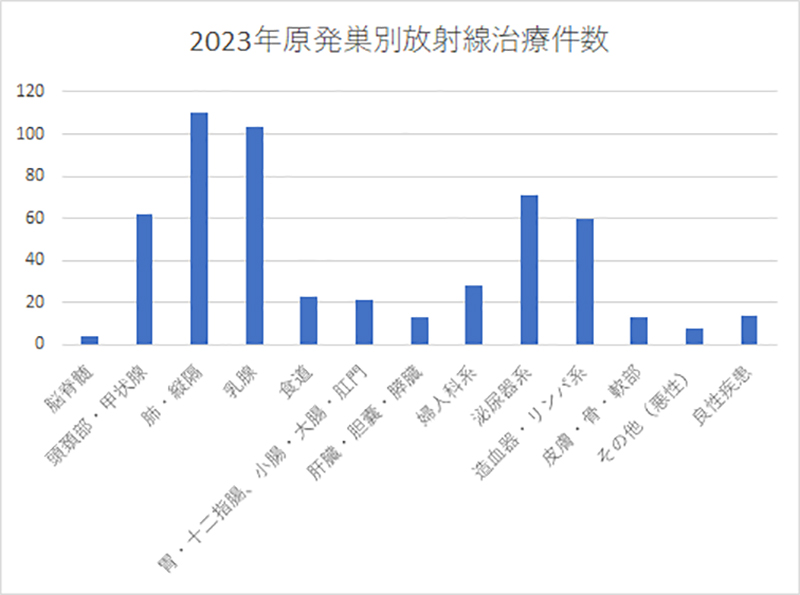 放射線治療の対象疾患は多岐にわたります。各診療科と協力して手術・化学療法と組み合わせた集学的治療に積極的に取り組み、良好な成績を得ています。代 表的疾患として、頭頸部がん、食道がん、子宮頸がん、前立腺がん、乳がん、肺がん等があります。また、がんの骨転移による疼痛は多くの症例で改善が得ら れ、がんによる管腔臓器狭窄やがんによる出血に対する止血などの症状緩和も可能です。